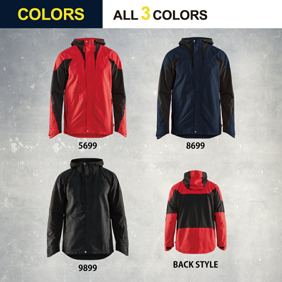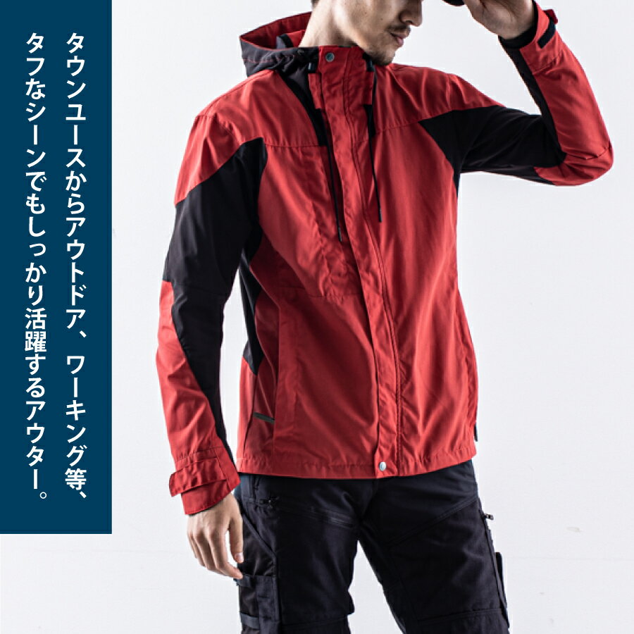 素材には、水気を弾くワックスコーティングが施されたポリエステルとコットンの混紡糸を使用し、ブラックのストレッチ素材を背中、袖、フードに使用することで適度に動きやすいデザインのオールラウンドジャケット。